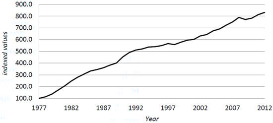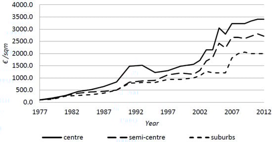 Our observation begins in 1977. The dynamics of rent are represented starting from the tertiary sector revolution (late-1970s and early-1980s), that changed the direction of city transformation. A centripetal force was added and partly replaced a centrifugal force. Until the 1970s demography was the main generative factor in real estate demand. In the post-industrial period development of tertiary functions, the changing needs of individuals, different compositions of households, and higher incomes produced a demand for an improvement in housing choice [].