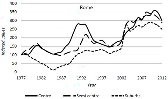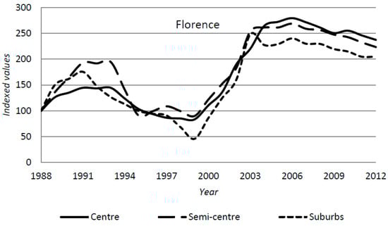The phenomenon is evident in cities such as Bari, Bologna, Florence (Figure 4), and Milan, where the dynamics of the values in the three zones (centre, semi-centre, suburbs) are nearly coincident in relative terms.