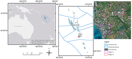 For the purposes of the study, the capital of Vanuatu, Port Vila was utilized. Vanuatu is a Y-shaped archipelago consisting of about 82 relatively small, volcanic origin islands [37]. Figure 1 gives an overall view of the territory of Port Vila as well as Vanuatu.