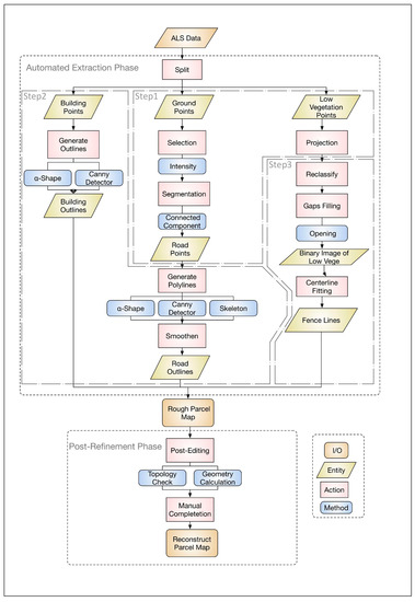 Specific approaches were selected to conduct each step. In view of the complex morphology of cadastral boundaries, these approaches were able to deal with the large number of datasets, as well as with particular targets of the cadastral objects. Afterwards, extracted line segments were edited and completed in the post-refinement phase.