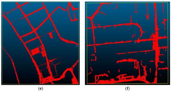 (a–f) Show how a rough road network was extracted in two regions, respectively. Specifically, (a,b) present the intensity filtering result; (c,d) illustrate the segmentation process; and (e,f) show the road extraction results of two region.