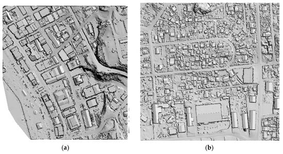 As illustrated as Figure 5, in region 1, building outlines were highlighted. Specifically, very closed building roofs were distinguished, as they were at different heights. The topography relief was also visible, which aids in separating road plane with roadside slopes. On the contrary, in region 2, whose topography is a flatter, hillshade visualization did not add much value. Even though building roofs were also highlighted, dense low vegetation was also mixed inside and ended up as noise.