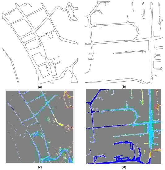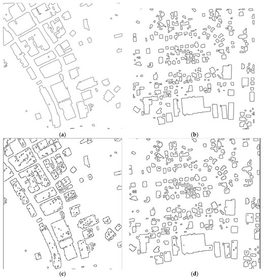 (a–d) Present the result of building outline generation of two regions. Specifically, (a,b) are the result of α-shape algorithm of two regions; and (c,d) are the result of Canny algorithm.