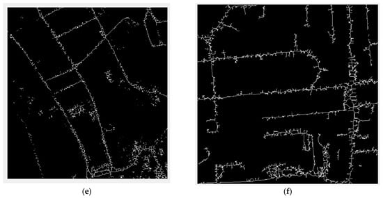 (a–f) Show how a rough road network was extracted in two regions, respectively. Specifically, (a,b) present the intensity filtering result; while (c,d) illustrate the segmentation process, and (e,f) show the road extraction results of two region.