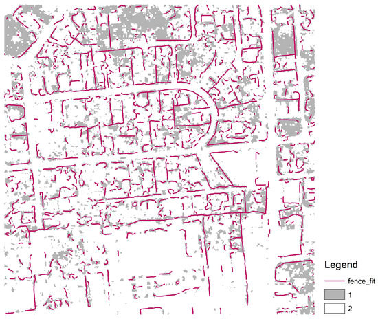 Line fitting results are shown in Figure 8a. Both centerline and outline were generated. Obviously, certain percentages of fence centerlines were drawn. The overview of parcels was vectorized into a polyline. Disconnecting pixels produced many very short line segments (shorter than 2 m), and they were unvalued noise.