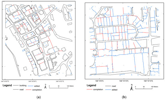 Manual completion was the final step for scene clearance. After determining the useful line segments with the help of visual interpretation, gaps among these line segments were manually filled in and short lines connected. Partition lines were created on the place where there were thought to be parcel boundaries. The final vector draft parcel maps of two regions are shown as Figure 9, respectively, edited lines are automated extracted lines but have been corrected or changed, while completion refers to lines that manually added. The whole manual editing process took less than half an hour to complete.