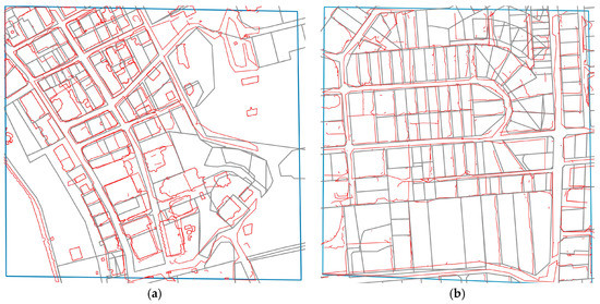 When overlaying all the automated extracted results with the orthophoto mosaic (the study regions’ cadastral situation), obvious mismatches between road boundaries and fitted lines emerged in both regions, due to the road thickness deduction along extraction. Furthermore, fitting lines and building outlines provide much more detail than roads boundaries. Generally, building outlines coincided with fitted lines, illustrating that the building extraction process approximately maintains the original shapes. However, the centerline-fitting approach produced a large number of short line segments. It was difficult to judge whether these sporadic short lines were meaningful.