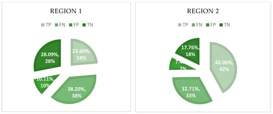 Figure 11 displays a straightforward illustration on parcels identification. It uses true, false, positive, and negative to summarize the overall performance on the parcel extraction. TP refers to parcels appearing in both extracted results and reference data. FP refers to where parcels were in reference data, but were not extracted. FN refers to those parcels that appear in the result, but do not exist in reference data. Lastly, TN refers to those parcels from the reference data that were only partly extracted or had a visible shift. TP describes the completeness of the parcel identification, and both regions achieved less than half, with region 1 having even less.