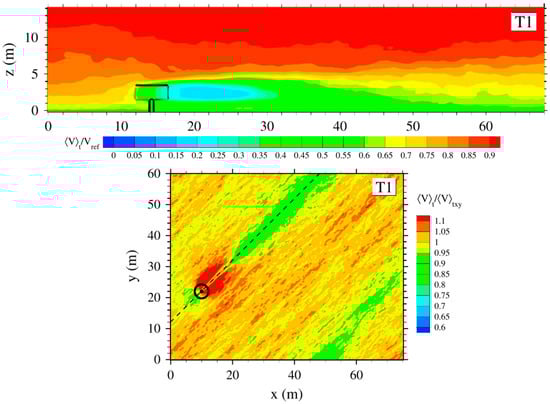 Flow visualisation downwind of a single tree, shown as: (top panel) the normalised time-averaged wind velocity (Vt/Vref) simulated by Dupont et al.’s [] model, shown in vertical cross-section. Solid black lines delimit the tree; (bottom panel) the normalised time-averaged wind velocity (Vt/Vtxy) simulated by the model at 0.1 m height, shown in horizontal cross-section. The solid black circle represent the tree crowns (adapted from [] (p. 176)).