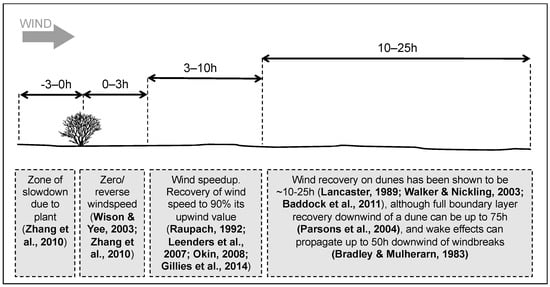 Theoretical calculations [,] and experimental measurements [,,,,,] suggest that protective wakes downwind of individual vegetation elements extend to approximately 7–10 h (where h is the height of the element). However, this can vary significantly depending on plant porosity, pliability and configuration.