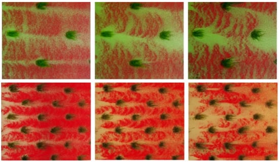Wind tunnel studies have proved useful for studying the relationship between vegetation and wind-blown sediment transport under controlled conditions. Experiments have been conducted using dead vegetation [], live vegetation [,], or artificial vegetation [,,,]. Suter-Burri et al. [] used coloured sand to visualize spatial patterns of sediment redistribution within grass tussocks, allowing them to relate different canopy densities to their theoretical flow regimes (Figure 6). Wedge-shaped wake deposits developed fully in the low-density case (representing isolated roughness flow), overlapped with adjacent downstream tussocks in the medium-density case (wake-interference flow), and deposited grains were evenly distributed around the tussocks in the high-density case (skimming flow). Suter-Burri et al. [] observed that the fraction of the surface that was exposed to erosion was substantially smaller (44–78%) than the area not covered by vegetation, owing to the turbulent wake structures around the tussocks.