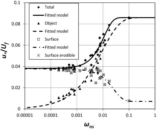 Shao and Yang [,] demonstrated that, in addition to and , it is sometimes useful to consider ‘skin drag’ (, i.e., the drag due to momentum transfer to roughness element surfaces). For ground surfaces with sufficiently large , Equation (1) becomes increasingly inadequate, so Shao and Yang [] included in a modified version of Raupach’s [] drag partitioning model. This allowed Shao and Yang [] to mathematically explain how increasingly closed canopies lead to a decrease in values, as is commonly observed in cases of skimming flow (see Section 2.1.2).