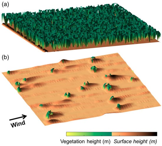 Three-dimensional representations of combined vegetation and surface morphology for a coupled Vegetation and Sediment TrAnsport model (ViSTA) simulation, with conditions similar to those observed in the Skeleton Coast National Park, Namibia. Figures show landscape at: (a) beginning of simulation, where the domain is artificially populated with shrubs; (b) after 25 years of arid conditions, where an equilibrium landscape of nebkha dunes emerges. Black arrow shows average wind direction (adapted from [] (p. 22)).