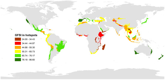 Overlay of biodiversity hotspots and Global Food Security Index (GFSI).