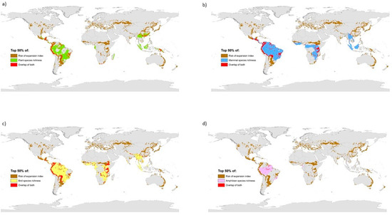 Panel of species richness for (a) plants (b) mammals (c) birds and (d) amphibians overlaid with risk of expansion index.
