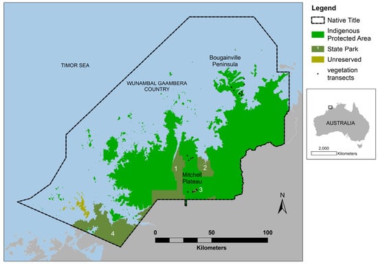 Rainforest patches were sampled at two locations to investigate the influence of patch distribution, environmental factors and potential threatening processes on rainforest plants. To do so, vegetation transects, running across the rainforest–savanna boundary, were established in the Mitchell Plateau and Bougainville Peninsula, and the data analysed []. Each transect included five 10 m × 20 m plots, and for each plot data on canopy cover, grass cover, rock cover, floristic, stand basal area, and number of adult trees were collected.
