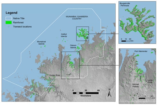 A map of rainforest patches in WGC. Insets show areas of high patch size and density at the Bougainville Peninsula and Mitchell Plateau, including transect locations. Note that patch size has been enhanced to better illustrate patch distribution at map scale.