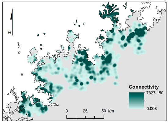 Patch connectivity of rain forests in WGC. Patches with high connectivity (dark shade, up to 7327.150) are larger and/or closer together than patches with low connectivity (light shade, down to 0.008).