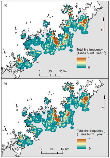 Heat maps showing total fire frequency in proximity of rainforests during (a) the unmanaged baseline years and (b) the project years.