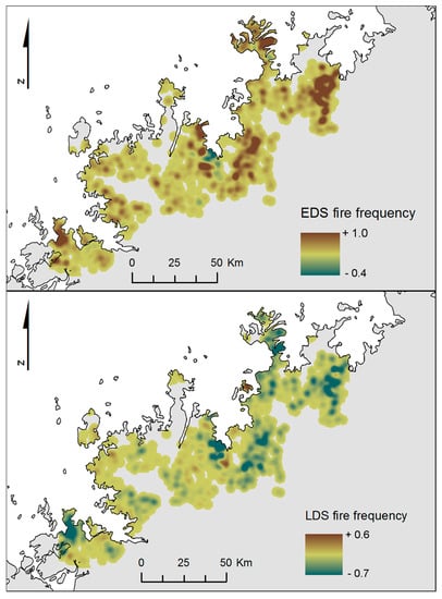 Prescribed burning, initiated under the Wunambal Gaambera Healthy Country Plan [] in 2012, resulted in a significant reduction in LDS fires between the baseline years and the project years (p < 0.001), and a significant increase of EDS and total fire frequency (p < 0.001 for both; Figure 6). Average frequency of EDS fires, LDS fires, and total frequency for the baseline years and the project years are reported in Table 1.