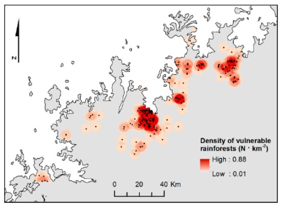 Location and density of the 5% most vulnerable rainforest patches, based on their size, distance from neighbouring patches, and fire frequency. The density map (red gradient) shows some clear clusters of vulnerable patches. Black dots represent single patches.