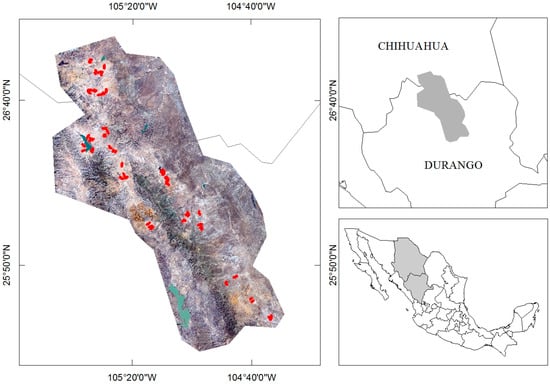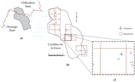 The area of Cuchillas de la Zarca (CUZA) is a priority region for the conservation of grasslands and is located within the Chihuahuan Desert. This desert grassland is the most extensive in North America and is recognized for having high species richness despite being a dry area. In CUZA we can find both transition areas dominated by grasslands and extensive plains covered by them []. The area of CUZA is located between the coordinates 105°04′30.86″ W and 24°41′41.28″ N, as well as 104°57′07.48″ W and 25°27′04.24″ N. It comprises the northern part of the state of Durango and the southern part of the state of Chihuahua, Mexico. It has an area of 11,600 km2 (Figure 1). The vegetation consists mainly of induced pasture, natural grassland, microphyll desert scrub, chaparral areas and pine-oak forest. In each of these vegetation types, grass species of the genera Bouteloa, Aristida, Buchloe, Andropogon, Melinis, Muhlenbergia, Sporobolus, Heteropogon and Pleuraphis may be present [,].