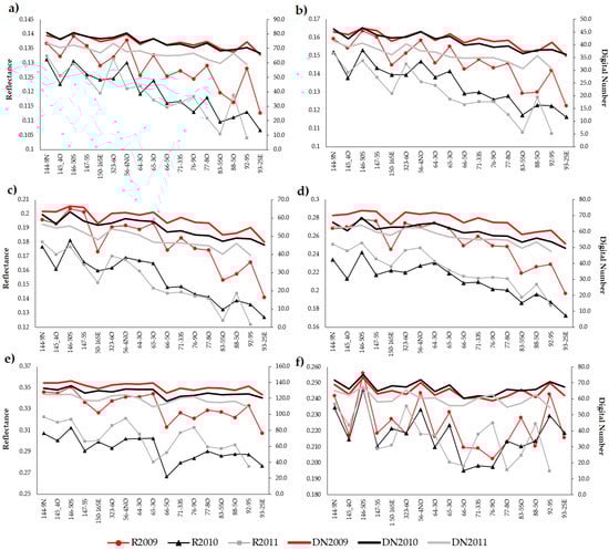 Spectral signature average expressed as reflectance and the digital number for each quadrant ((a) band1, (b) band2, (c) band3; (d) band4, (e) band5, (f) band7).