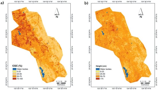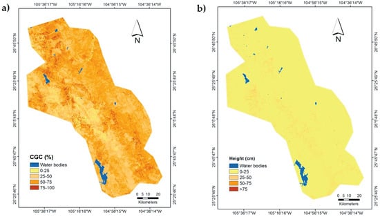 Area in percentages occupied by the ranges of (a) Coverage of Grass Canopy (CGC) and (b) grass height in the region Cuchillas de la Zarca.