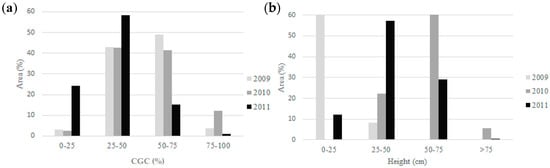 (a) Coverage of grass canopy (CGC) and (b) grass height distributions for 2011.