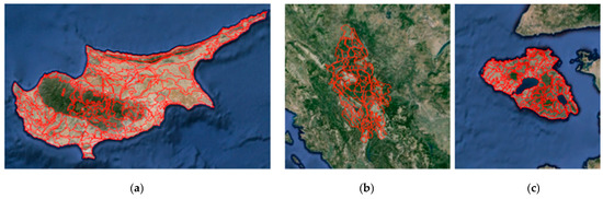 Risk assessment model study areas in the partner countries. (a) Cyprus Area: 9251 km2; (b) Greece—Epirus Area: 6790 km2; (c) Greece—Lesvos Area: 1632 km2.