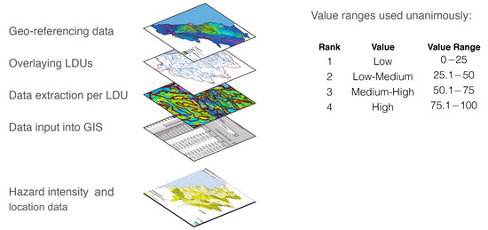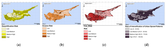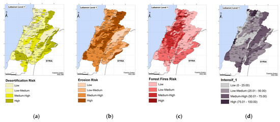 Hazard assessment is the key element of risk analysis. It is carried out by processing info taken from different kinds of maps and/or field-work. In our research the evaluation was conducted at the level of the LDUs and the hazard rating was carried out using the related GIS maps (Erosion, Forest fire, Desertification, and Intensification of urban sprawl) and data provided by the project’s partners based on their availability. The magnitude of the risk per each of the LDUs was identified and ranked using the qualitative classification with a score ranking from 1 (minimum hazard) to 4 (maximum hazard) as per Figure 4.