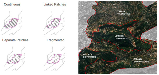 This assessment was carried out per LDUs by relying on high-resolution satellite imageries. A continuous landscape (rank 4) was the most valuable type, as characterized by being an uninterrupted patch with few construction/road networks, quarries, etc.; whilst a fragmented landscape (rank 1) was the least valuable type, marked by heavy urbanization and land-reshaping activities (Figure 5).
