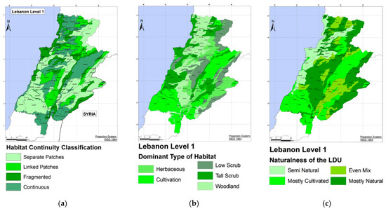 Maps of Lebanon’s habitat continuity (a), dominant habitat (b), and naturalness (c).