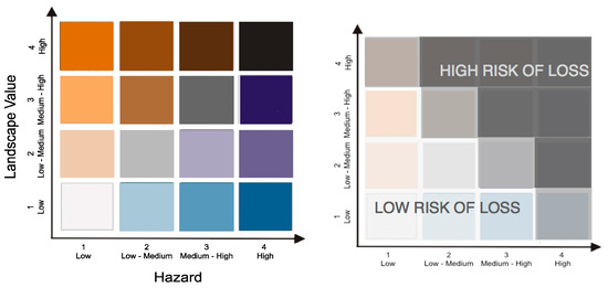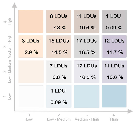 The two-dimensional matrix for a risk legend enabled us to spatially represent the results of our study (Figure 20). Furthermore, it plays an important role in the evaluation process of the effects of the risk in relation to the loss of landscape character of the affected area. For each chosen Hazard in every selected area, it enables us to estimate and judge the risk of a reduction in LV that is directly proportional to the intensity of the hazard. In the upper part of matrix, highlighted as ‘high risk of loss’, the dark colors detect the LDU’s that are subjected to a greater risk. It means that they are areas of particular interest for protection/conservation land-use decisions, and indicates a more pressing need of attention. In Lebanon, 57.29% of LDUs lie within the high risk of loss zone, 31% lie within the medium risk of loss zone, and 9.79% lie within the low risk of loss zone (Figure 21).