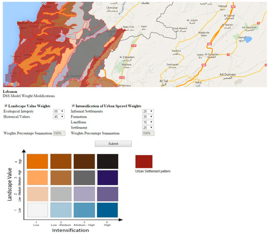 Ryan et al. (2006) discuss opportunities to involve stakeholder participation in land use decision problems for greenway planning applications [60]. Most of the SDSS or C-DSS models contemplate the inclusion of stakeholder participation, i.e., the Collaborative Multi-Criteria Spatial Decision Support System (C-MC SDSS) for the evaluation of multifunctional landscape according to a human smart perspective [57]. In the C-MC SDSS, awareness and multidimensional reading of the landscape are considered the two important focuses for a smart local development. In the East Mediterranean, there is no evidence of effective public participation in the decision-making process. In Lebanon, for example, top-down “modernist” urban planning approaches—which continuously favor local elites such as politicians and landowners and pay little attention to social and community interests—are still commonly observed [61]. Citizens’ involvement in the planning process is implemented in only a few scattered situations. Furthermore, stakeholder involvement in the LCA process during the MEDSCAPES project was not very successful due to the low rate of responses we were able to collect through the interviews we conducted during the first phase of the project. Thus, we were not able to incorporate the insufficient data gathered in the LDSS database, but we aimed at spreading awareness on landscape related topics by visualizing through our user’s interface the effects that today’s actions could produce in our territories in the East Mediterranean. Through workshop and seminars training we were able to introduce the audience to the interface and to let them visualize, for example, the consequences that the spread of urbanization could have on future development and, in particular, on the landscape seen as a human-ecologic system, which can offer a wide range of benefits with positive effects on the quality of life of the local community. On the other hand, our tool foresees the user’s interaction as manipulation of rank and weight of indicators with particular emphasis on intensification of urban sprawl and ecological integrity. The user-friendly interface allows multiple users to provide input and generate real-time output to support negotiated spatial decisions [62]. The LDSS framework, through weighing and evaluating alternatives, will help decision makers in conceptualizing alternatives and thus in considering the related decisions for future planning. Once an alternative is selected and implemented the results could be compared with the produced scenarios and then a revaluation of the criteria could be done. The scenarios act as crucial bridges between environmental/landscape science and policy. They influence policymaking by summarizing and synthesizing scientific knowledge in a form that can be used by policymakers to develop policies [63]. Our method, which did not incorporate quantitative information on the public preferences and values attributed to the landscape, has the advantage of being easy to perform and it has the capacity to easily communicate the outcomes of the LCA and LRA to a large and diverse audience through the scenarios’ maps; it also has the benefit of being interactive, thus giving to the users the possibility to manipulate the data and spatially visualize the related scenarios.