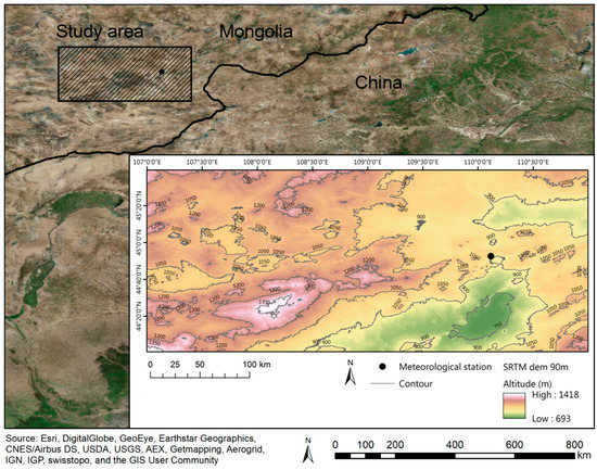 The study area is located in Dornogobi, Dundgobi and Umnugobi provinces in semi-arid Mongolia. It is part of the drylands of the eastern Gobi, and has been identified as a source of dust storms (Figure 1) [1]. The semi-arid desert climate was determined from the Aridity Index of Millennium Ecosystem Assessment [9]. The annual average precipitation in Sainshand (Station number: 443540) is 111 mm. Precipitation from June to November accounts for approximately 82% of the annual precipitation. In contrast, the precipitation from December to May is 18% of the annual precipitation.