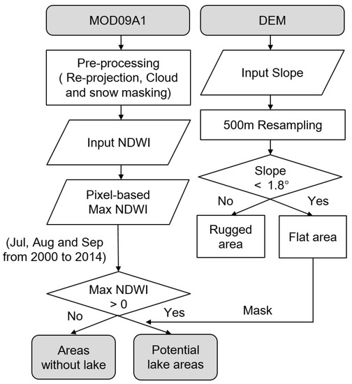 Using satellite remote sensing technology, the identification of dry lake beds has not been firmly established until now. In the case of an optical satellite, identification by spectral characteristics is difficult because the soil is bare in semi-arid regions such as Mongolia. Therefore, previous identification methods of dry lake beds have focused on geographical characteristics (such as low lying areas and plains) and the watershed topography of dry lake beds [10]. This method identifies watershed areas during a target period, with the identified watershed area defined as a potential dry lake bed. Figure 2 shows a flow chart for the identification of potential dry lake beds. Here, the Normalized Difference Water Index (NDWI) is a numerical indicator that uses the visible red and near-infrared bands of the electromagnetic spectrum to analyze remote sensing measures of water areas and wet surfaces. The NDWI can be written as Equation (1) [11].