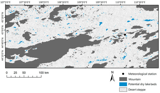 Dust storms are a common phenomenon that may negatively affect human and animal health. In severe cases of dust storms, deaths of livestock have been reported in East Asia [1]. Because a large quantity of soil particles are produced by erosion and sedimentation transportation and deposit in dry lake beds [2], such dry lake beds represent areas where dust emissions occur [3]. Ginoux et al. (2012) found dust sources to have natural and anthropogenic origins, with natural dust sources accounting for 75% of global emissions and anthropogenic sources accounting for 25% [4]. Satellite images of dust storms in the Gobi region often show that large dust clouds are comprised of many well-defined plumes that emerge from “point” sources [5]. Farebrother et al. (2017) found a strong power relationship between the lake area and the mass of deflated lake bed sediments in Southeastern Australia [6]. In Mongolia’s Gobi Desert, dry lake beds have been identified as a source of high-frequency dust storms. In fact, the Gobi Desert has been recognized as an important dust storm source region [7]. Dry lake beds are considered to contribute a substantial amount of global dust emissions and to be responsible for “hot spots” of dust outbreaks. Existing studies investigate potential water resources in the Gobi for use in many sectors, including regional planning, agriculture, and nomadic grazing. Water resources are identified through topographic and optical images obtained from remote sensing satellites and integrated into GIS to investigate and identify potential shallow water correlated to paleolakes and dry lakes beds [8]. These fields require an understanding of when and how water collects and evaporates across a given area.