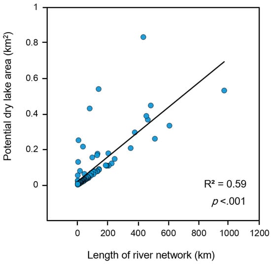 We then collated the identified dry lake beds with the river network found within our study site. The surface flows provide runoff within the lower dry lake beds through the river network (Figure 5). Dry lake beds in lower elevations can be understood as being part of a well-developed river network. In addition, the area of dry lake beds showed a tendency to increase (Figure 6) (R2 = 0.59, p < 0.001, N = 109). Because of rainfall occurrence, intermitted surface flows appear within the lower portions [13], with the area of potential dry lake beds increasing as a result of an extended river network. Thus, the geographical characteristics of dry lake beds became clear when found in low elevations, which developed the river network.