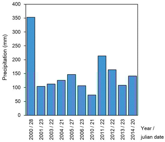 Potential dry lake beds were clarified from the differences in the relationship between precipitation and the formation of lakes (Figure 8). Precipitation was extracted when ephemeral lakes were formed for the first time in each year. The total precipitation over eight days was 369 mm in 2000 and at least 73 mm in 2010. In addition, ephemeral lakes were the largest in area in 2000 (Figure 7). It has also been suggested that the threshold for ephemeral lake formation in dry lake bed areas in semi-arid regions is eight days of precipitation.