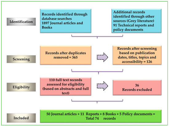 Data for this study were collected from primary and secondary sources. Data from secondary sources were obtained through a systematic procedure (Figure 1). This was developed using keywords and other search options such as Boolean operations (AND, OR), using methods described by Waddington et al. [26]. Resources available through databases: Web of Science, SCOPUS, Springer Link, JSTOR, Google Scholar and other library resources were used. We used both published literature (Journal articles and books) and grey literature in the form of government policies and legislative documents, technical reports, land use and land management plans obtained from government departments and government printing and publishing agencies.