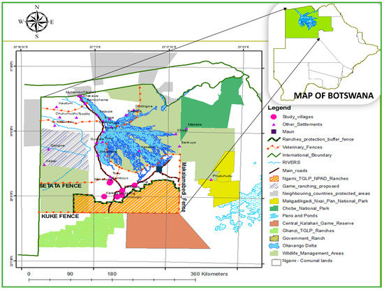 Ngamiland District is situated in North Western Botswana and includes the Okavango Delta. This makes it an important ecosystem characterised by both drylands and water bodies, abundant wildlife and enthralling traditional cultures. The district’s major economic activity is substance pastoralism, with limited arable agriculture on drainage plains [48]. The district was selected for this analysis because previous studies by Basupi et al. [50,56] identified the region as characterised by land use competition, conflicts and environmental problems, some of which are attributed to animal health and land tenure transformation policies. The case study provides critical lessons on crucial issues such as the interplay between pastoralists’ interests and larger national conservation goals.