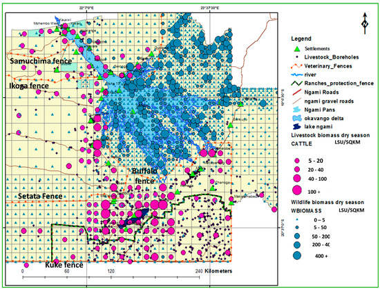 Dry season wildlife and livestock biomass in Ngamiland (based on wildlife aerial survey counts by the Department of Wildlife and National Parks)—livestock distribution pattern shows a high density in communal areas especially around water resources such as Lake Ngami.