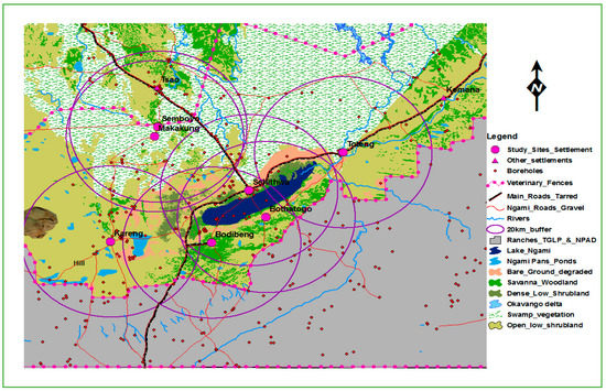 In communal areas south of the Okavango Delta, blocks of commercial ranches were demarcated and allocated under both TGLP and NPAD policies [50]. Wildlife Management Areas (WMAs) emerged in the 1980s as a result of a national land zoning exercise following the introduction of the TGLP [48]. As such, land is broadly zoned into distinct uses consisting of communal areas, National Parks, Game Reserves, Conservation areas (operated as tourism concession areas), privatised ranches and Wetlands (Figure 2). However, land use allocation and overlaps of different land use types create a complicated system resulting in pressure and conflict among people, wildlife and livestock [50]. With an average annual rainfall of 350 mm, the area falls into the semi-arid or dryland transition zone. Surrounded by fences, the remaining communal area south of the Setata veterinary cordon fence is about 7500 km2 in extent. The livestock numbers are high (at 203,269 cattle; 27,552 goats; 10,148 sheep; 5432 horses and 5644 donkeys (Department of Veterinary Services, Botswana, 2016 livestock statistics report)) which makes the regulation of grazing areas difficult. Although some members of the population are involved in arable farming, it is usually flooded recession agriculture in riverbeds and Lake Ngami floodplains because the soils are too poor elsewhere to support meaningful agricultural activity. As a result, pastoralism remains the main economic activity. The case study, therefore, offers an ideal setting for studying user-perspectives on land tenure transformation and pastoralists’ rights. Owing to the district’s unique ecological and socio-cultural variation, land tenure transformation and landscape fragmentations has resulted in a new generation of social, economic and environmental challenges; livestock diseases which are difficult to control in crowded areas, limited adaptive capacity and conflicting policies and actor priorities. Table 2 summarises the key issues/themes that emerged from the review of the wider literature and shows how these issues manifest in Ngamiland. Figure 2 shows the current land use zones and the case study area/villages while Figure 3 shows the livestock and wildlife spatial distribution patterns and density.