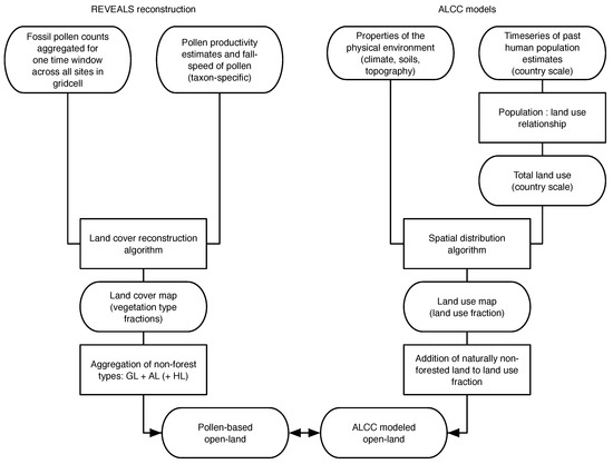 To further ensure that enough fossil pollen samples were present in each time window, the REVEALS reconstructions were performed on a 1 geographic grid. We aggregated the ALCC scenarios to the same grid resolution as the REVEALS reconstructions and filtered these datasets to include only those grid cells where the pollen data were present. The driving variables, processes and output of the ALCC and REVEALS methods are summarized in Figure 1.