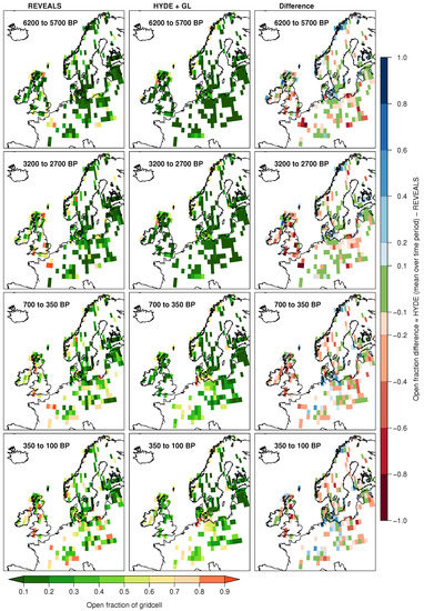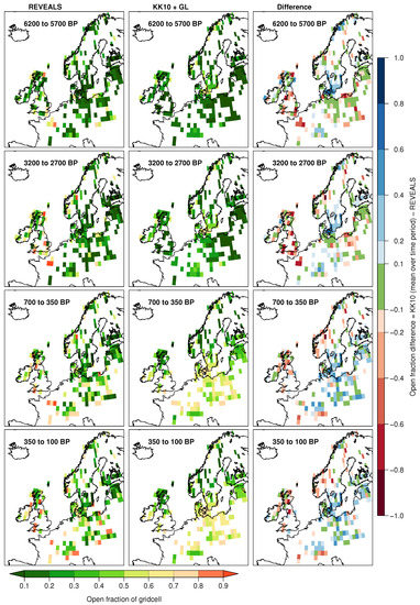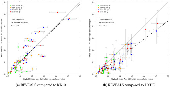 Comparison of REVEALS with land use observations largely informed by satellite remote sensing for the “present-day” time window (0–100 bp) shows that the REVEALS estimates of open land fractions are realistic in magnitude and spatial distribution. The REVEALS estimate of open land for this period is largely controlled by the core-top or youngest sample in the record, which in practice integrates over a 10–50-year period depending on the sedimentation rate, dating up to and including the year when the site was collected (ca. AD 1970–2010). The HYDE land use data used as a comparison is largely a function of present-day land cover observed with satellite remote sensing, combined with national land-use statistics on crop and pasture. During this period, major cities and agricultural areas were in roughly the same location as at present. As the uncertainty in HYDE for this period is low (ca. 11%), the fact that REVEALS and HYDE have good correspondence (Figure 2) is evidence that the REVEALS algorithm works reasonably well for translating pollen percentages into land cover, as has been demonstrated earlier for several sub-regions of Europe [46,61,62]. Comparisons of HYDE with REVEALS reconstructions that include the heather (HL) fractions do not match as well (slope of 0.828; Figure S2), and we omitted HL from our primary analysis. Though heathlands can develop due to anthropogenic influences such as grazing and fire, many are natural and do not result from human activities [53,54,63]. This evaluation of the REVEALS method provides confidence that the REVEALS reconstructions are suitable for the evaluation of KK10 and HYDE scenarios for preindustrial time.