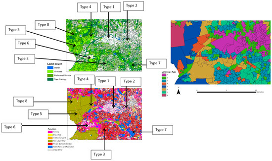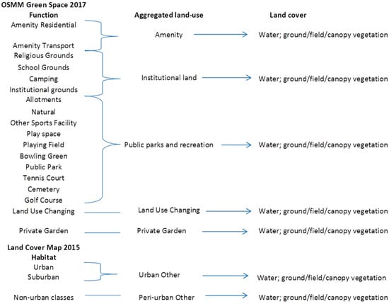 The methodology presented here demonstrates the possibility of integrating currently available land use data such as those published by the U.K. Ordnance Survey with a land cover classification derived from high-resolution satellite imagery. The resulting composite dataset exhibits the ability to capture landscape features (integrating land use and land cover), indices, and a related typology congruent with existing socio-geographic units (U.K. national census tracts). Use of the latter as spatial extents for processing and analysis is particularly advantageous given that they reflect statistical units at which population, socioeconomic and health-related data are regularly reported. The primary use of recently available high-resolution remotely sensed data with global coverage (Sentinel 2A satellites, launched 2015 [54]), combined with a universally applicable classification scheme based on simple ecological stratification, highlights the potential of the method for work in other urban and human-dominated landscapes in a range of climates. The capacity to integrate elements of function and form in human-dominated landscapes and reflect multiple social and ecological dimensions of use and quality presents a key opportunity for explorations of human health and ecological condition in social–ecological systems.