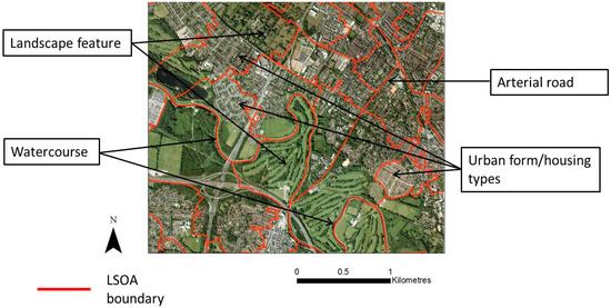 Much data are already available in spatial units that seek to capture local socio-geographic homogeneity, such as in the case of U.K. census data. The boundaries that are described by such units provide a useful spatial template for the development of effective landscape metrics and associated datasets. Given the increasing centrality of the natural environment in approaches to understanding human well-being, the generation of landscape typologies coterminous with spatial units employed in the gathering and dissemination of socio-demographic data is desirable from a spatial analysis point of view. Not only do such geographical units provide the basis for the reporting of a range of local area statistics, such as national census data, they also commonly delineate socioeconomically coherent spatial units. For example, in England and Wales, census reporting units (known as Lower Super Output Areas (LSOAs)) are designed to be socially homogenous in nature reflecting tenure, dwelling type and socioeconomic status [61]. They are also determined according to population and accordingly their spatial extent is a reflection of local population density. The spatial character of LSOAs is, furthermore, often shaped by elements of green (e.g., woodland), blue (e.g., watercourses) and grey infrastructure (e.g., major roads) in the landscape (Figure 3). Accordingly such socio-geographic units present a useful spatial template for the development of a landscape typology related to human-dominated systems, such as those in urban areas.