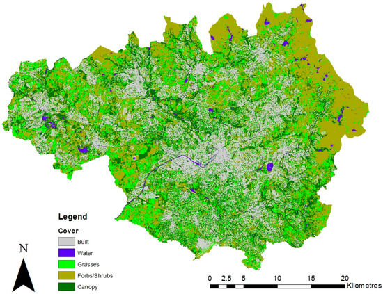 Initial interrogation of the five-category land cover classification (see Figure 4) demonstrated satisfactory levels of accuracy (overall accuracy 85%) consistent with internationally recognised standards [67,68]. The dataset resulting from this initial classification is presented in Figure 4.
