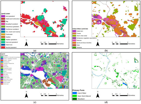 The principal advantage of such datasets is their breadth of cover, providing a national and continental repository of thematic land use. They are limited, however, in their ability to offer information on landscape structure and patterns of vegetation. Furthermore, Urban Atlas [43] and U.K. Land Cover Map [44] data reveal inconsistencies resulting from variation in mapping units and resolution (see Figures 5 and 7). These inconsistencies, although expected for datasets employing different mapping units and resolution, are relevant given the prevalent use of both of these datasets in international research into urban environments (e.g., [39,45,46,47,48,49,50,51]) and policy guidance [22].